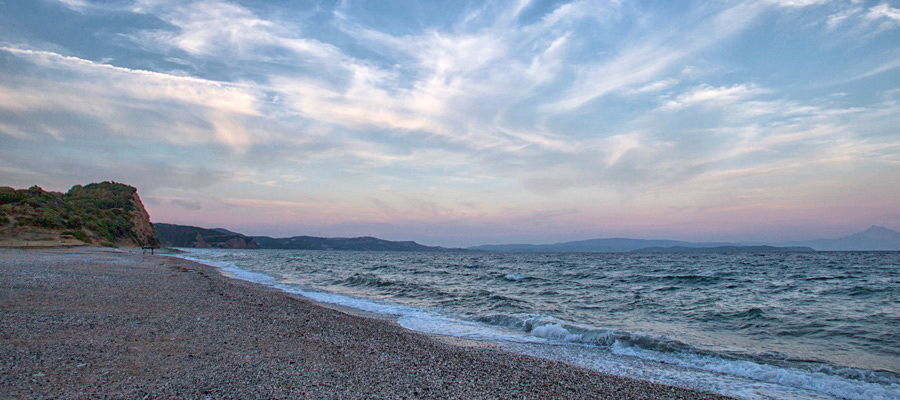 Pirgos is a secluded, pebbly beach, with a few stubbles, a couple of farm houses rammed in plane-trees and a few fishing boats.