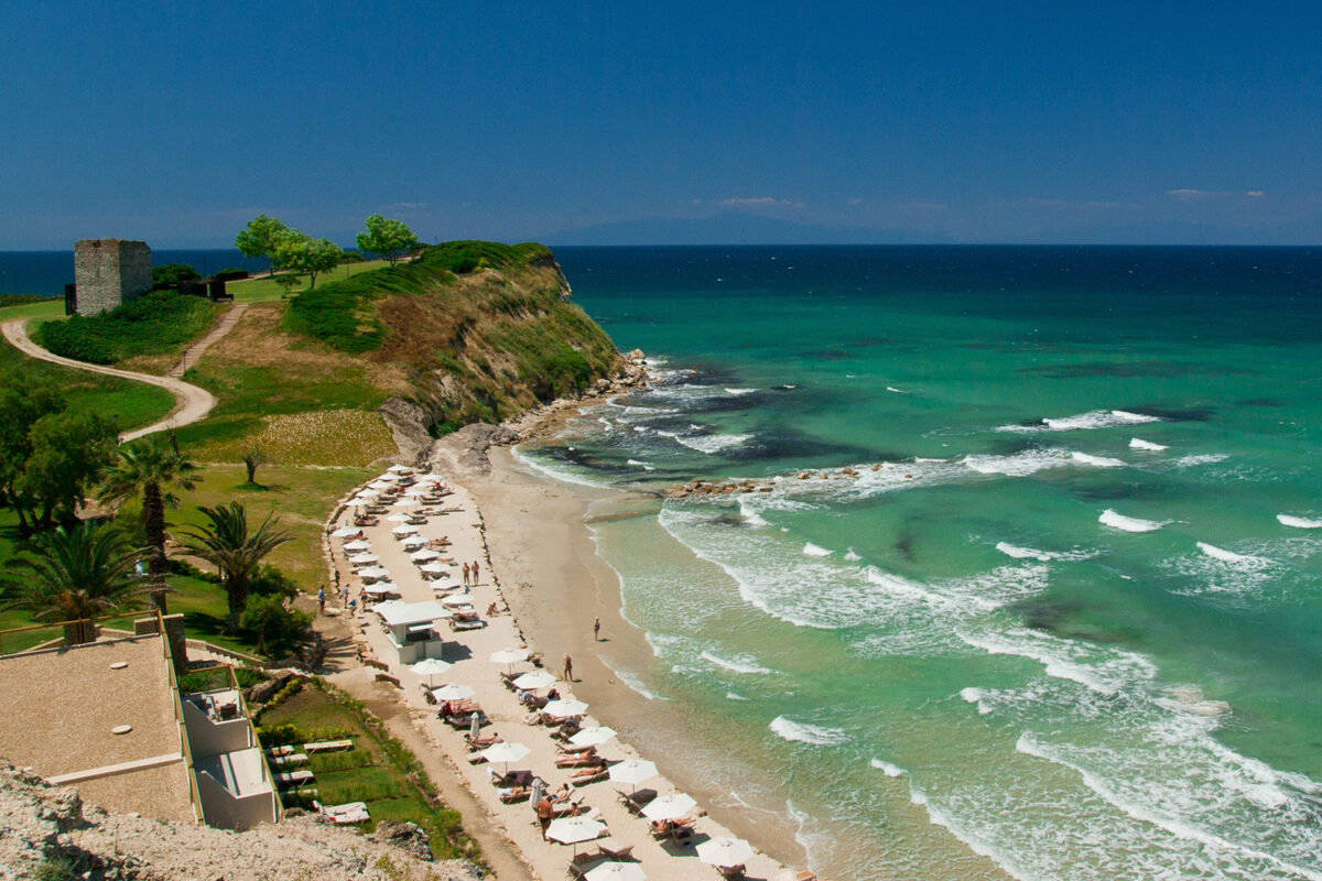 The coast of Sani, Blue Flag awarded is one of the most popular in Kassandra due to its proximity to the city of Thessaloniki. It’s a long and sandy beach with very shallow waters and has a range of beaches located at both sides of Stavronikita’s Monastery Tower.